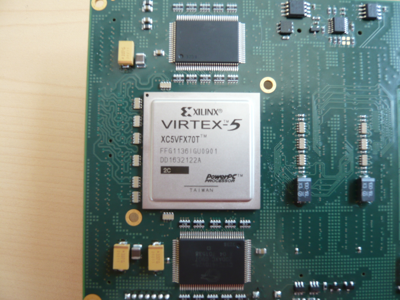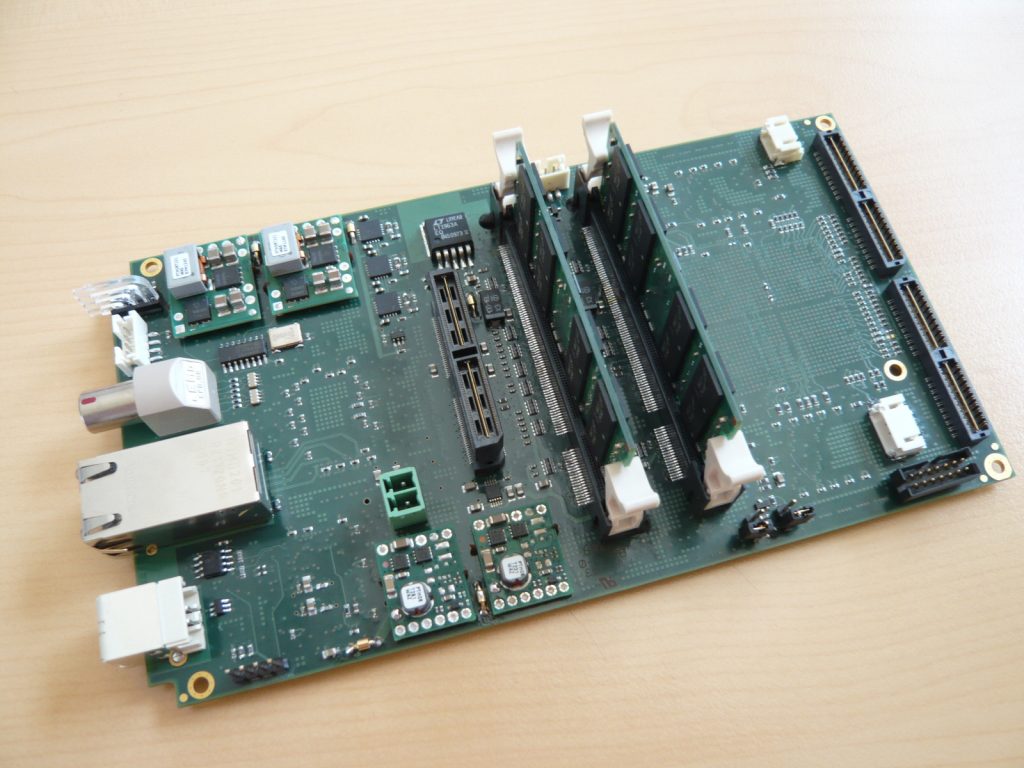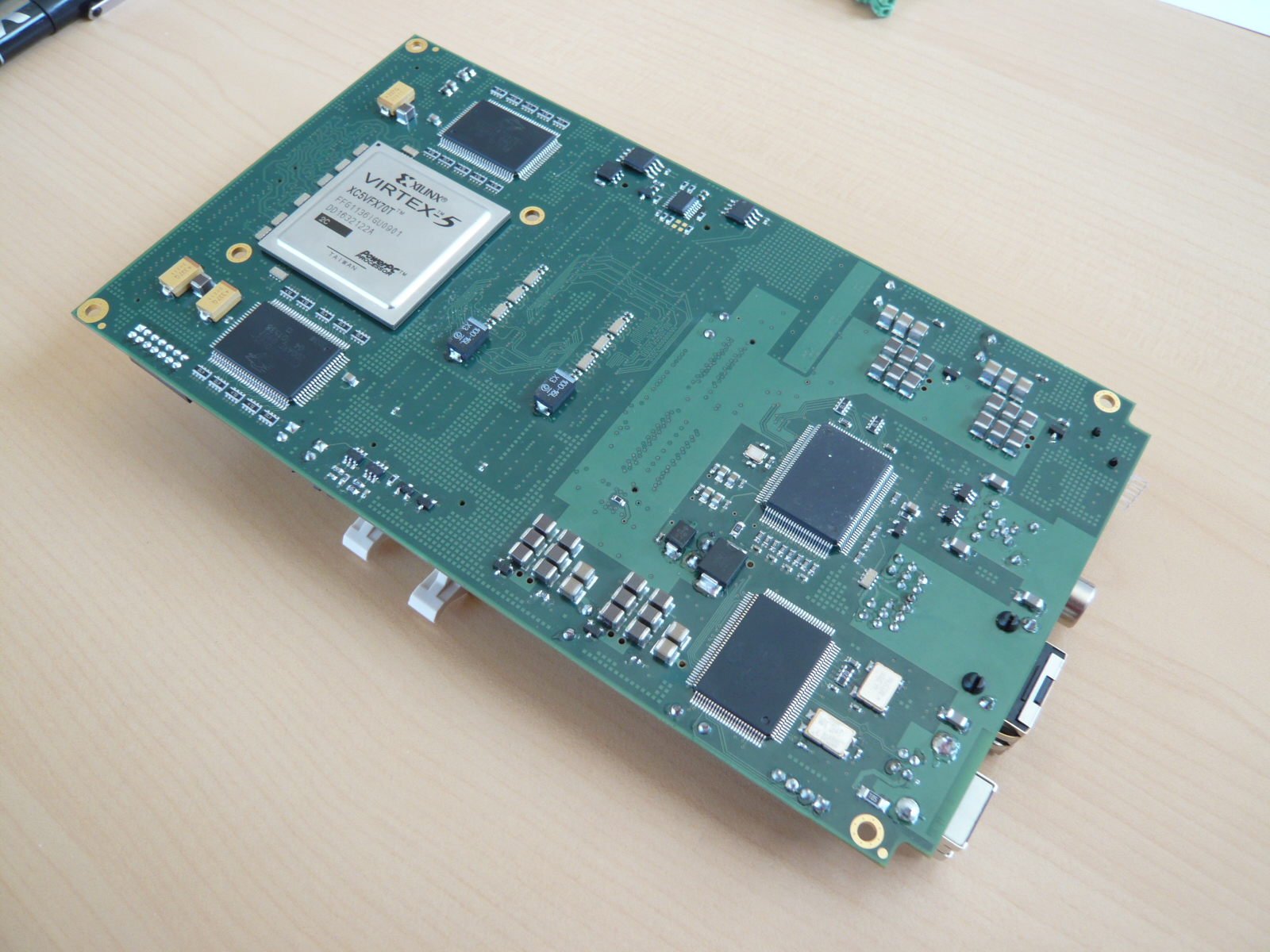 Carte de traitement vidéo très haut débit équipée d’un FPGA haut-de-gamme, de mémoires RAM et DDR rapides ainsi que divers bus de communication.